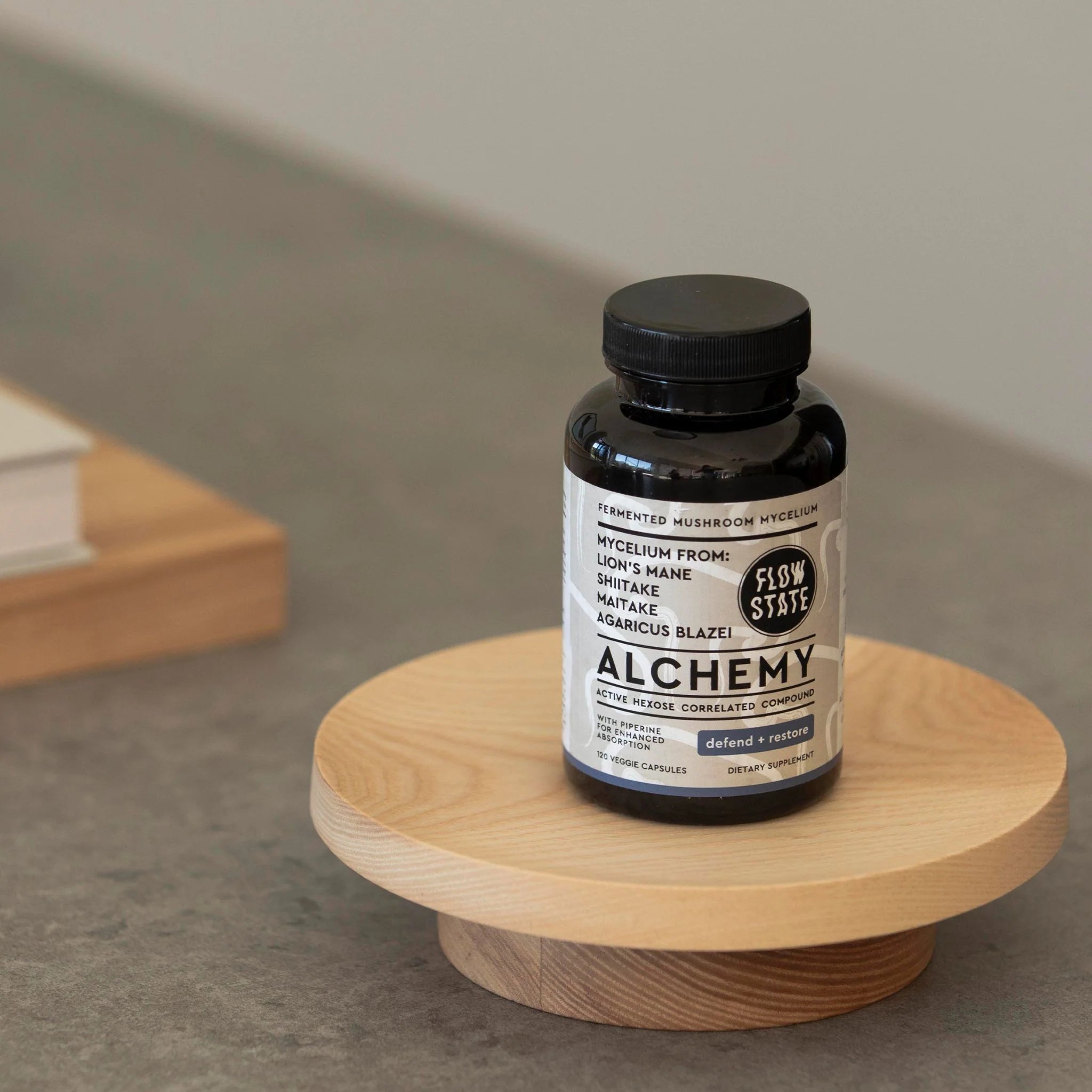 Unlike many mycelium-based supplements grown on grain, Alchemy is produced using a liquid fermentation process to ensure purity, potency, and bioavailability, without grain residue or unnecessary fillers.