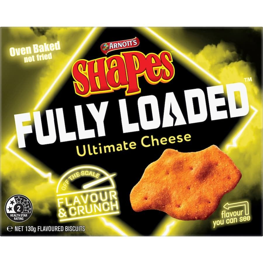 Arnott's Shapes Fully Loaded Ultimate Cheese Crackers are oven baked for a crispy texture. Packed with intense cheese flavour you can see, every bite delivers a bold crunch and delicious taste.