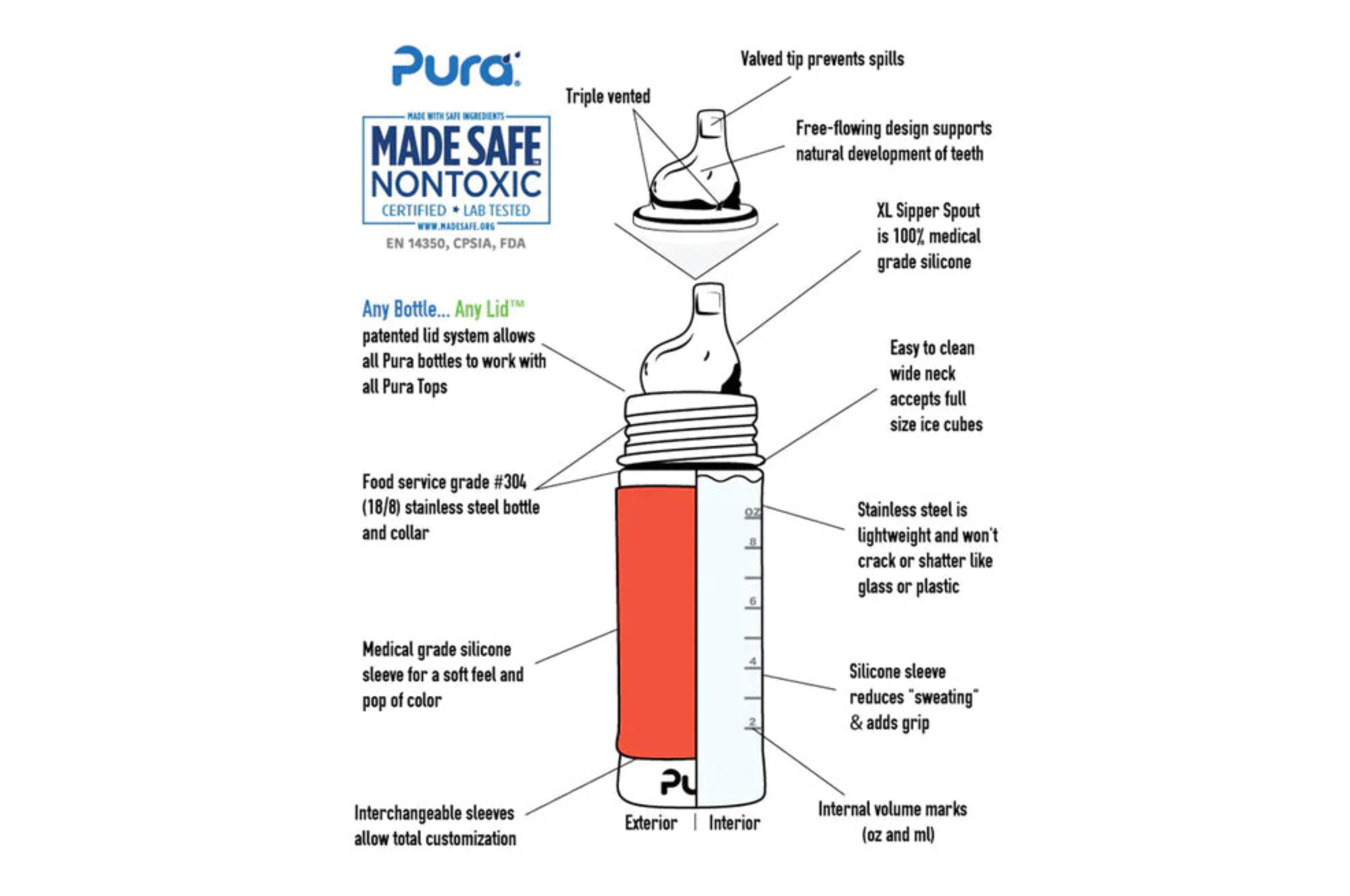 The only toddler and infant bottles without any plastic! Pura Kiki Bottles are made from completely non toxic stainless steel and 100% medical grade silicone, meaning absolutely no toxins leaching into your child's drink.