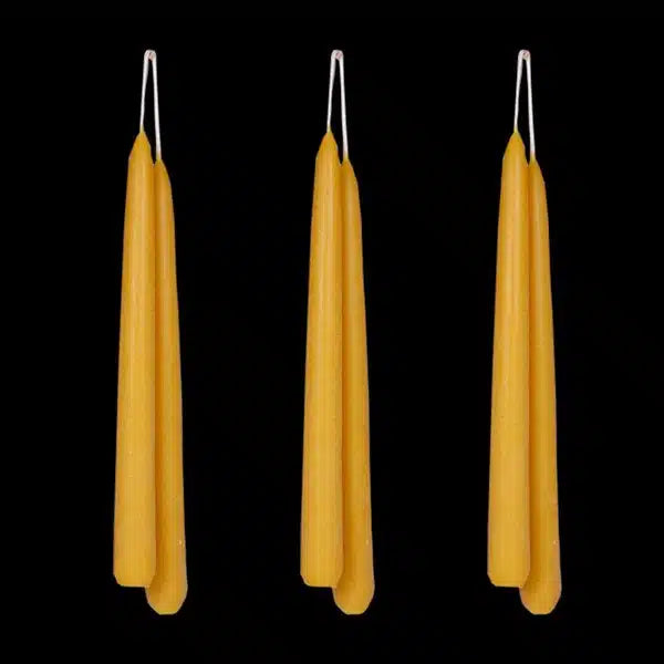 Beeswax Hand-Dipped Candles 200mm – Pair Over 135g of pure beeswax in this hand-dipped candle. At 200mm tall. 100% Pure and Natural Beeswax Candles These beeswax candles are made from 100% pure and natural beeswax. Our beeswax candles are free of paraffin and artificial chemicals. Beeswax is a pure natural by-product obtained from producing honey. These beeswax candles are hand dipped to a drop shape, perfect for presenting in your stylish candle-holders. These candles have no added scents or other additives, so they yield the lovely pure and natural scent of beeswax that harks back to the honey and hive of honey bees. The Benefits of Beeswax Candles for Mood and Feel These elegant beeswax candles are for imbuing a space or event with a magical ambience. Transform your room or dinner table for a memorable occasion with the delicate light from these beeswax candles. Create the perfect romantic setting for that special love in your life with the unique scent and glow of beeswax candles. Relax after a busy day and lift your spirit by burning a calming yet energizing beeswax candle. More Benefits of Beeswax Candles Because beeswax has a higher melting point than other materials for candles, a beeswax candle emits the brightest, most warm-toned flame. Beeswax candles last longer and drip less than most other candles because they are so dense. This means that beeswax doesn’t need any hardeners, additives, or chemical treatments to make a quality product. When beeswax candles burn, they clean the air like a great, natural, air purifier. Just like lightening, beeswax candles produce negative ions when burning. These negative ions attach to positive ions (like dust, pollen, mold, odor, toxins) floating in the air and in this process cleans the air. Other pure and natural beeswax candles available in this range. Beeswax Pillar Comb Candle, Beeswax Cube Comb Candle, 3 x Beeswax Cube Comb Candles