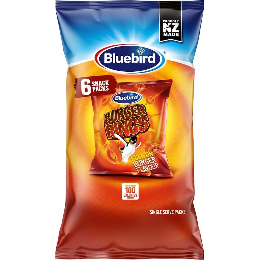 Enjoy the bold taste of burger flavour with Bluebird Burger Rings in this convenient 108g multipack containing 6 snack-sized packs.