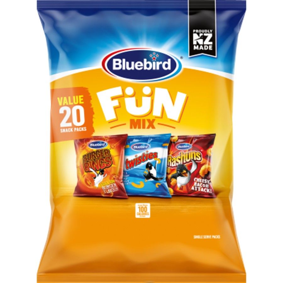 Enjoy all your favourite flavour-packed snacks with the Bluebird Multi Fun Mix 20-pack, featuring a tasty combo of Rashuns, Twisties, and Burger Rings. Perfect for lunchboxes or sharing with friends and family, this handy multipack has something for everyone who loves bold, crunchy treats.