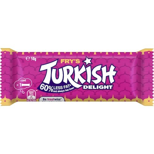 Enjoy the unique combination of soft Turkish Delight jelly wrapped in smooth milk chocolate with FRY'S Turkish Delight bar. With 60% less fat than typical chocolate bars, it’s a lighter way to satisfy your sweet cravings. Treat yourself to this classic favourite!