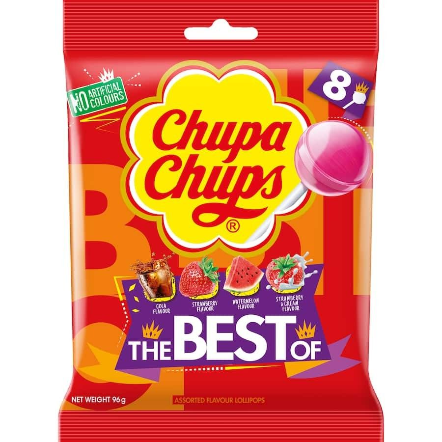 The Chupa Chups Lollipops 8 pack brings together the brand’s most popular flavours in one handy bag. Enjoy favourites like strawberry, strawberry & cream, watermelon, grape, and cola—perfect for sharing or treating yourself. All your top Chupa Chups flavours, conveniently in one pack!