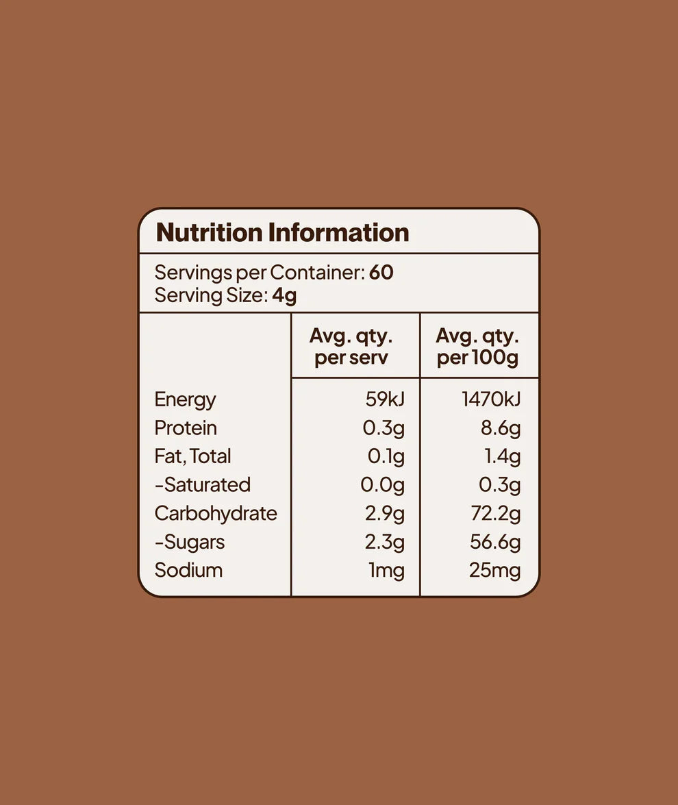 Organic Unrefined Cane Sugar, Organic Ceremonial Grade Japanese Matcha Green Tea Powder and Natural Cinnamon Flavour Powder.