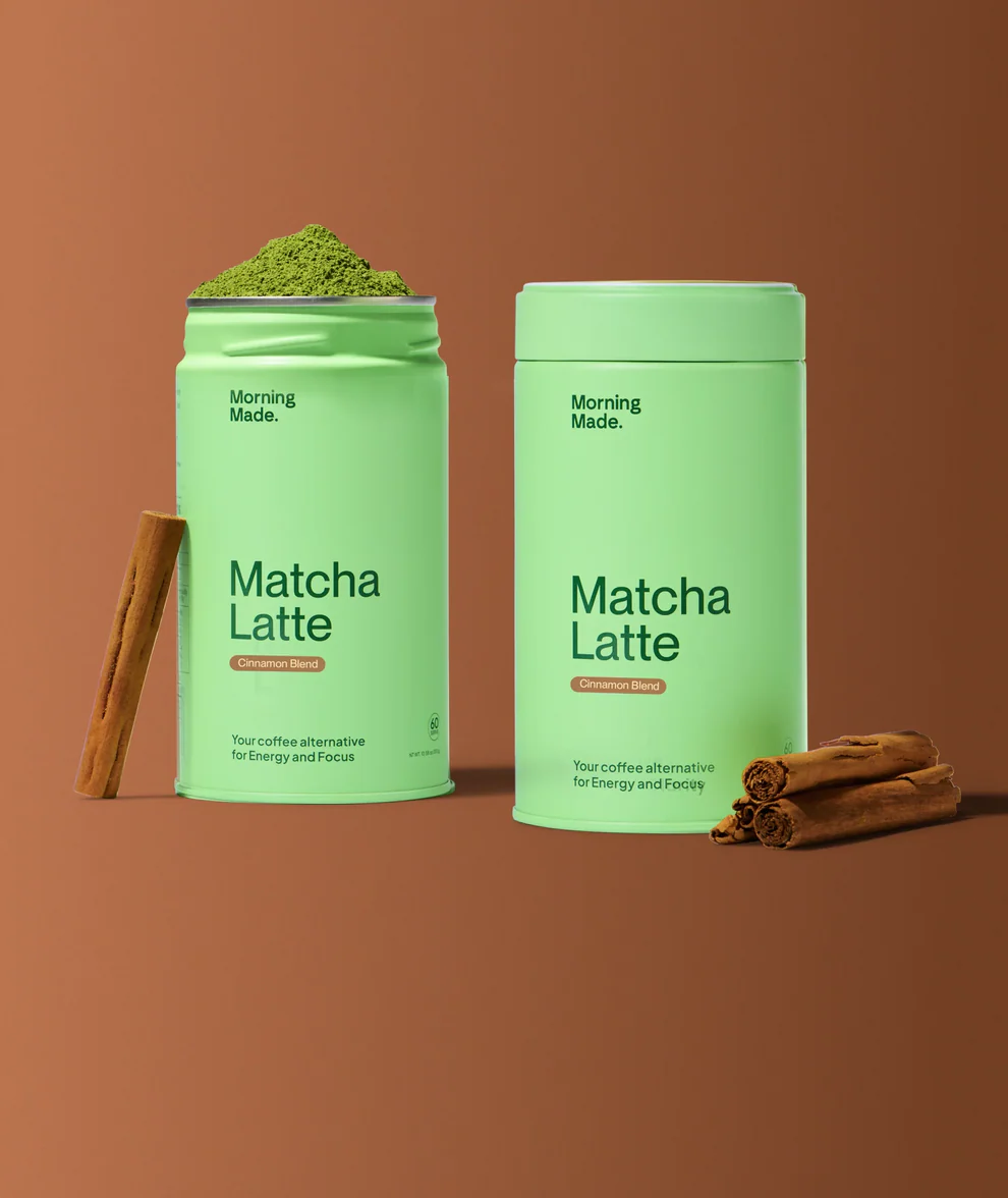 Organic Unrefined Cane Sugar, Organic Ceremonial Grade Japanese Matcha Green Tea Powder and Natural Cinnamon Flavour Powder.