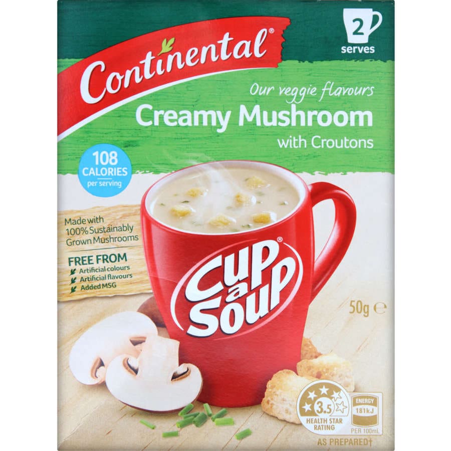 Enjoy a quick and satisfying snack with Continental Cup-A-Soup Creamy Mushroom with Croutons. This convenient soup is perfect for any time of day, offering the comforting flavour of creamy mushroom paired with crunchy croutons. Delicious taste from a simple packet—ideal for when you need something warm and tasty in no time.