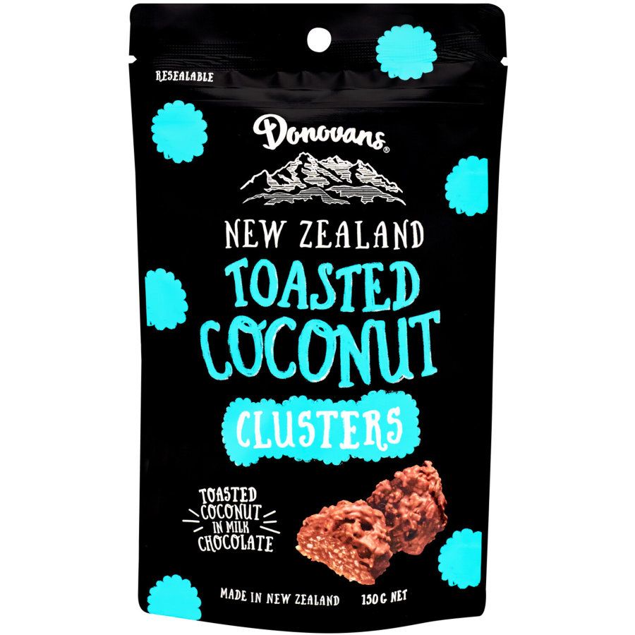 Enjoy the delightful blend of Donovans 35% milk chocolate and toasted coconut thread in every bite. These toasted coconut clusters come in a convenient 150g re-sealable pouch, perfect for snacking or sharing.