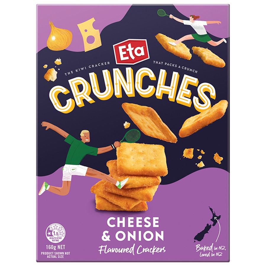 ETA Crunches Cheese & Onion are flavour-packed, crunchy crackers made right here, perfect for satisfying those snack cravings. Baked—not fried—for a lighter bite, they're ideal for sharing or enjoying as a post-game treat.