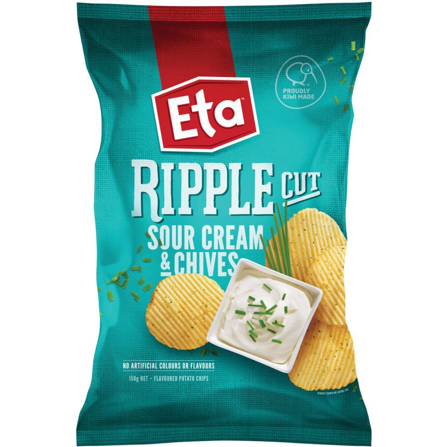 ETA Ripple Cut Chips Sour Cream & Chives are made using locally grown potatoes. The potatoes are simply sliced, cooked, and seasoned to create deliciously crunchy chips with a natural golden colour. ETA has been making quality chips since the 1970s, using a straightforward process to deliver that classic taste in every bite.