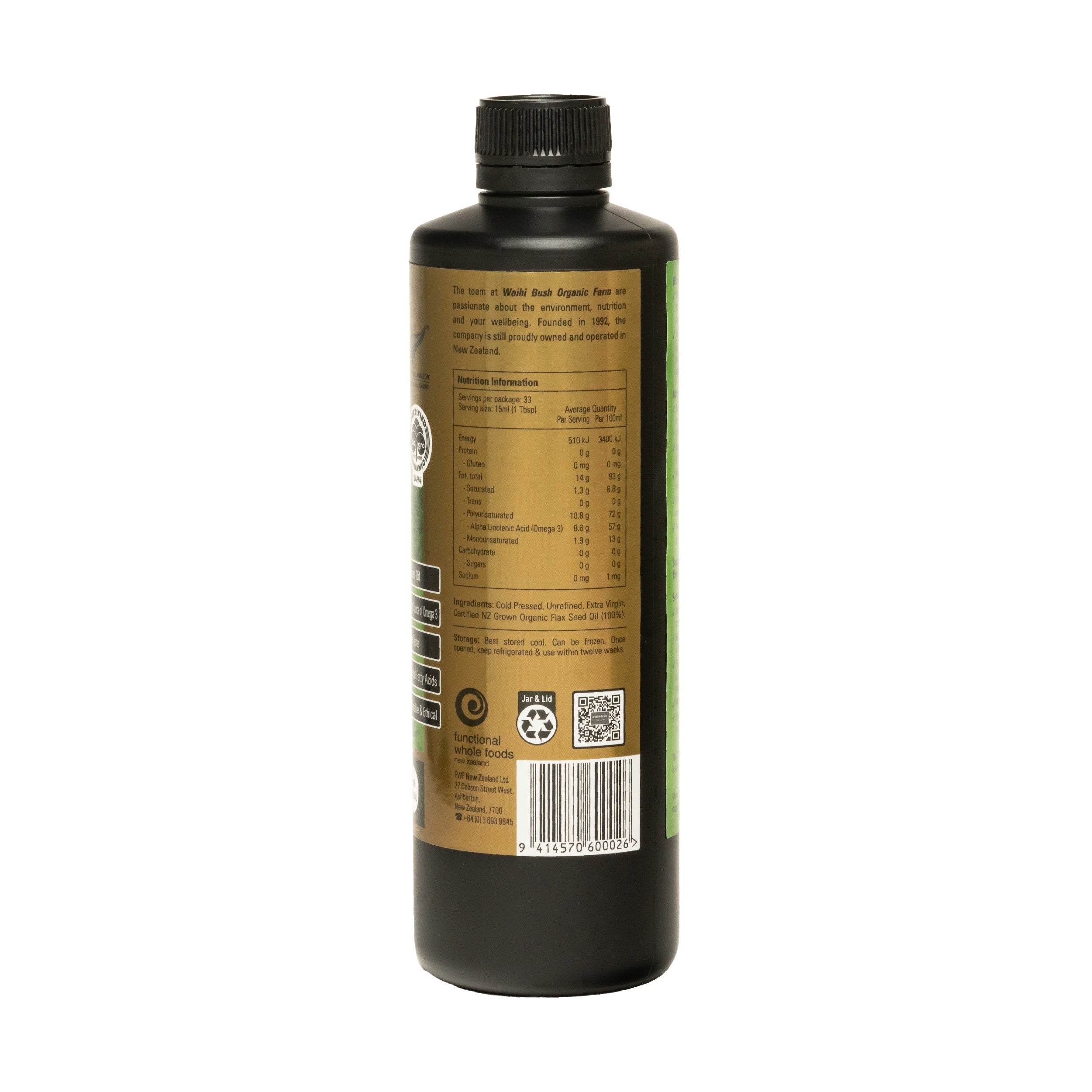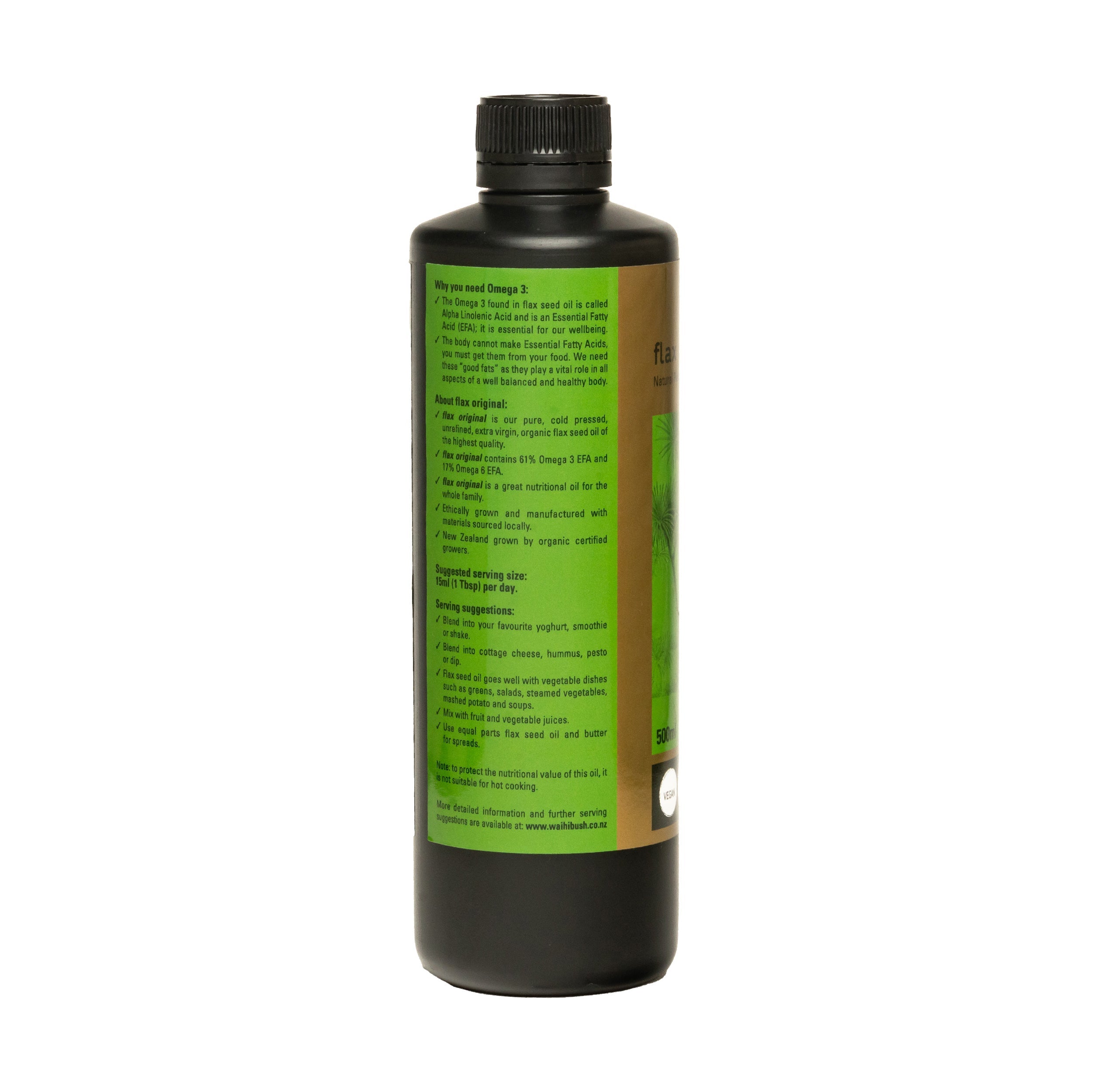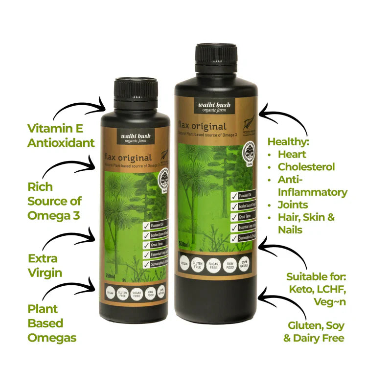 Flax Original is 100% pure, cold pressed, unrefined, extra virgin, certified organic flax seed oil of the highest quality. It typically contains 60% Omega 3 EFA - Alpha Linoleic Acid (ALA), 14% Omega 6 LA and 16% Omega 9.