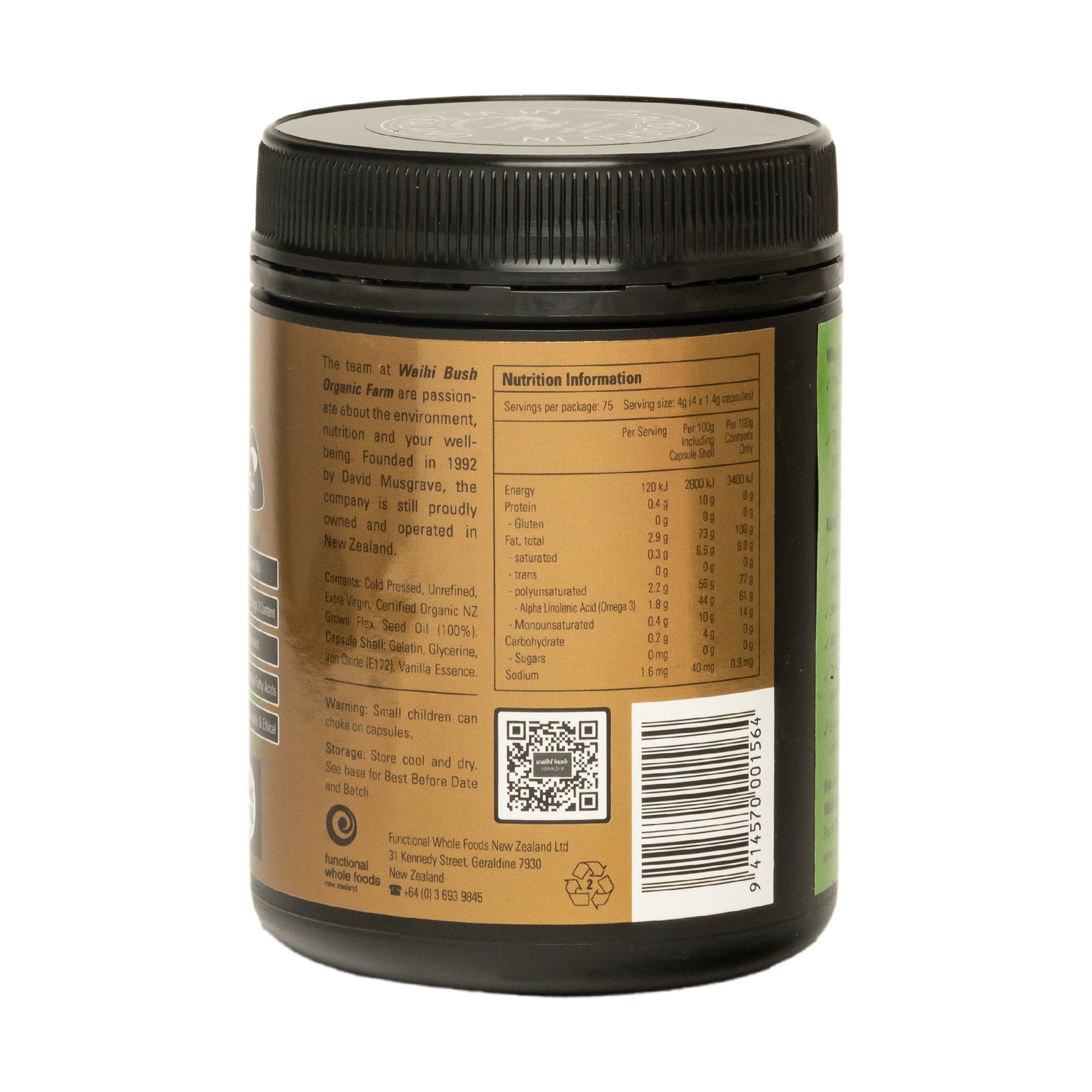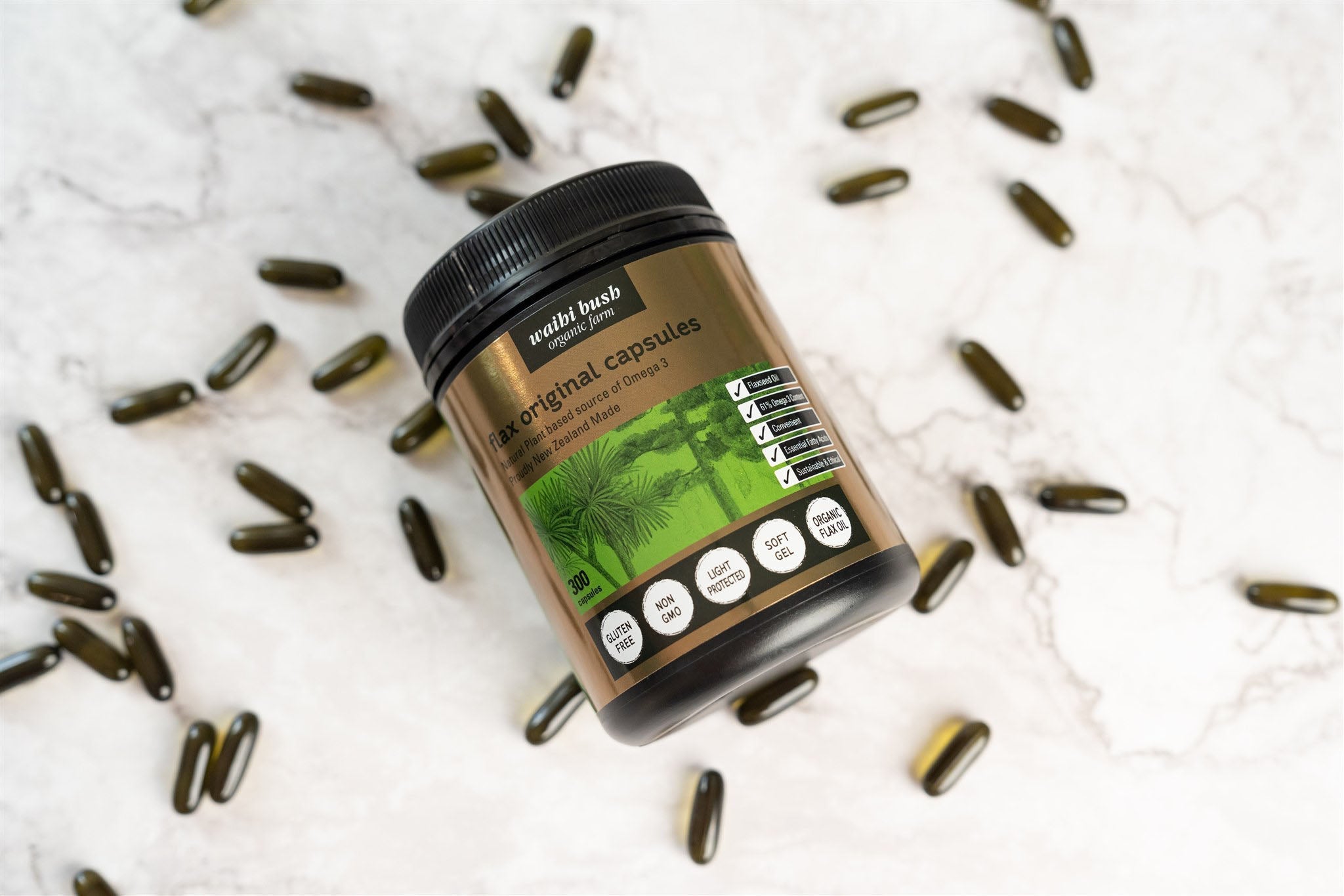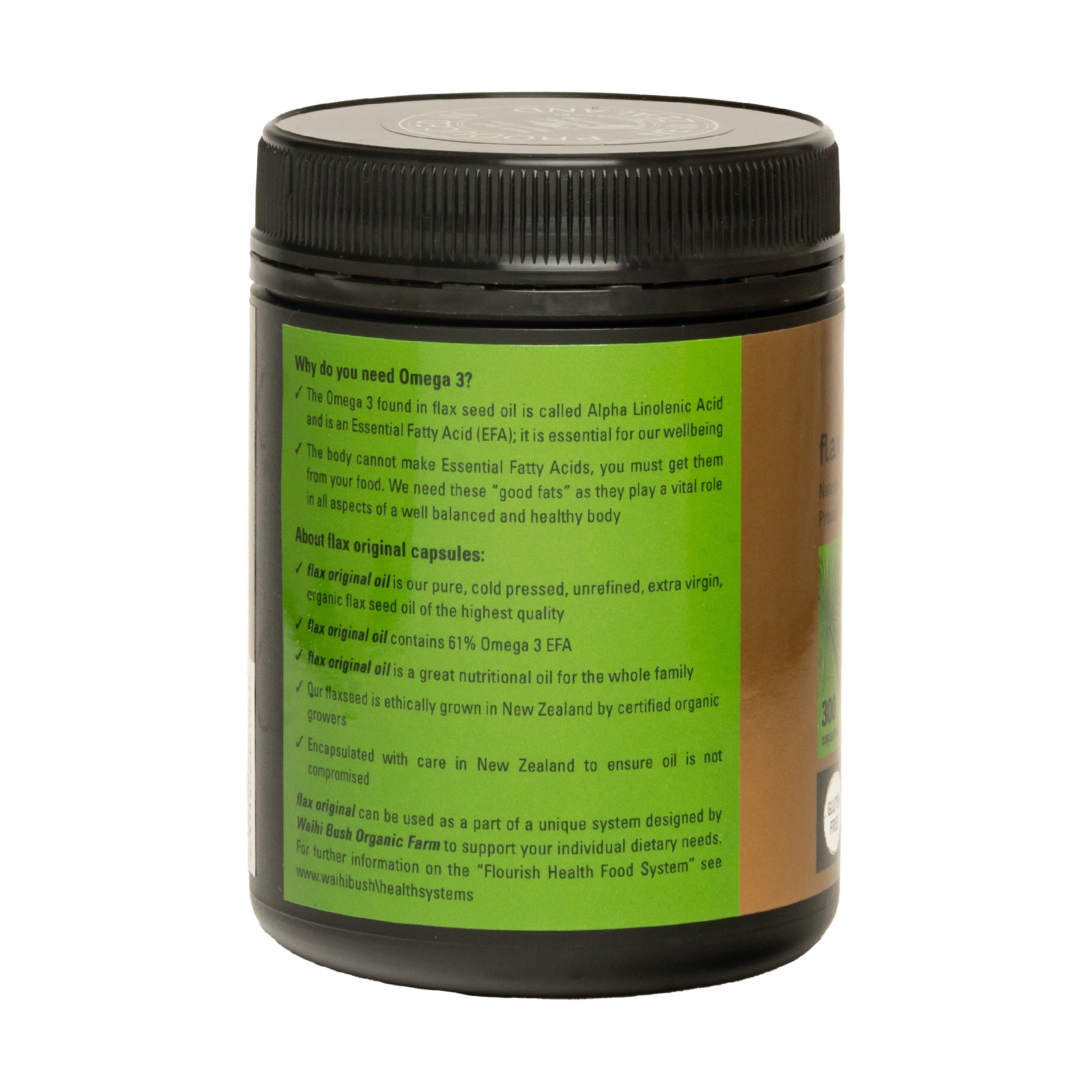 Our Waihi Bush Flax Original Capsules contains our great Certified Organic Flax Original Oil enclosed in a dark soft gel capsule to seal in all of the goodness you expect from our Flax Original Oil.
