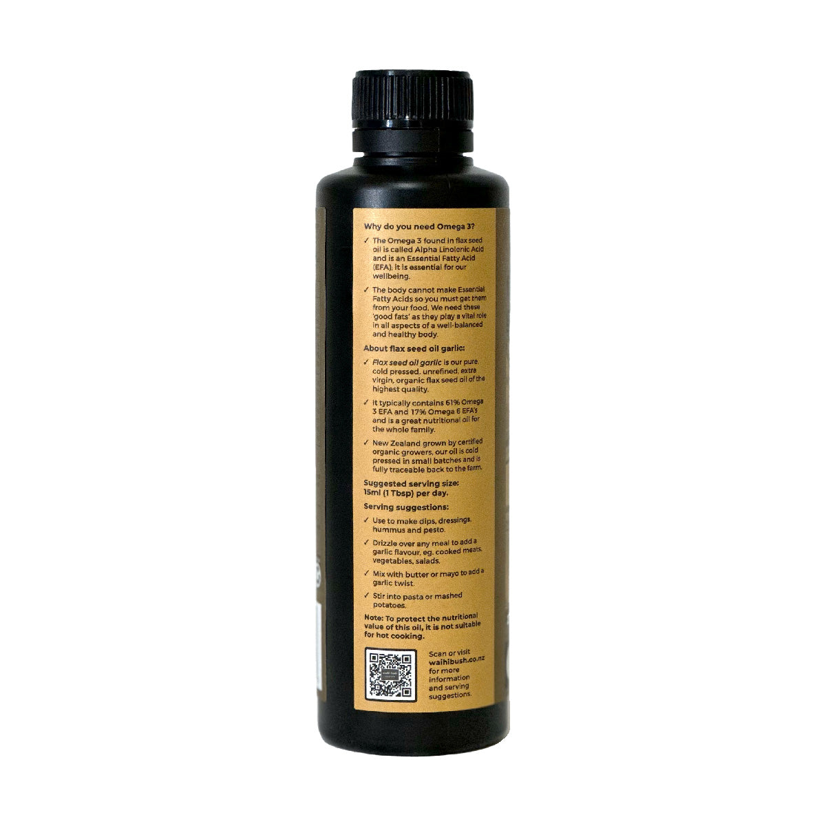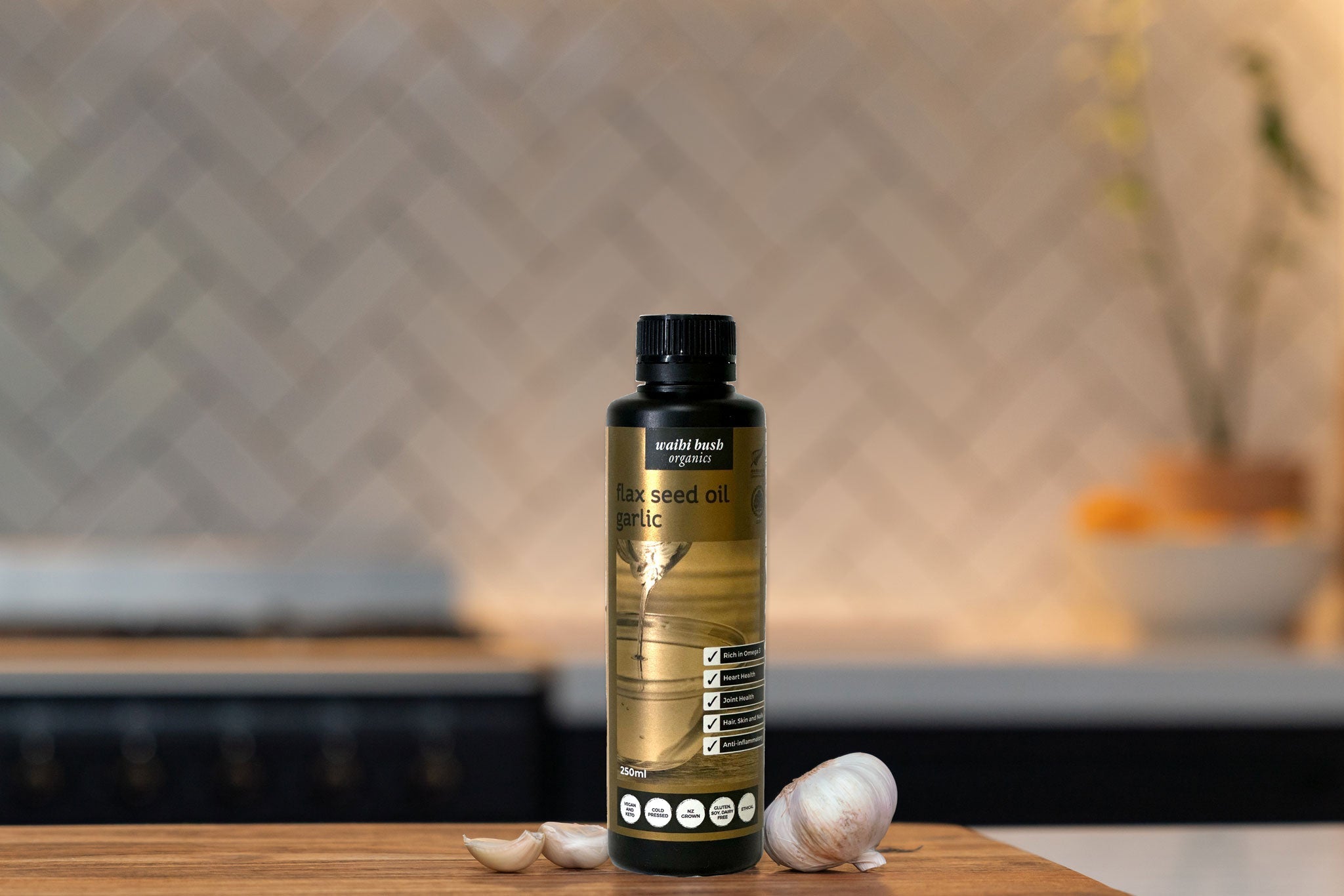 - The Oil: Our pure New Zealand grown, cold pressed and fully traceable Flax Seed Oil Original infused with a savoury nutty punch of Garlic.