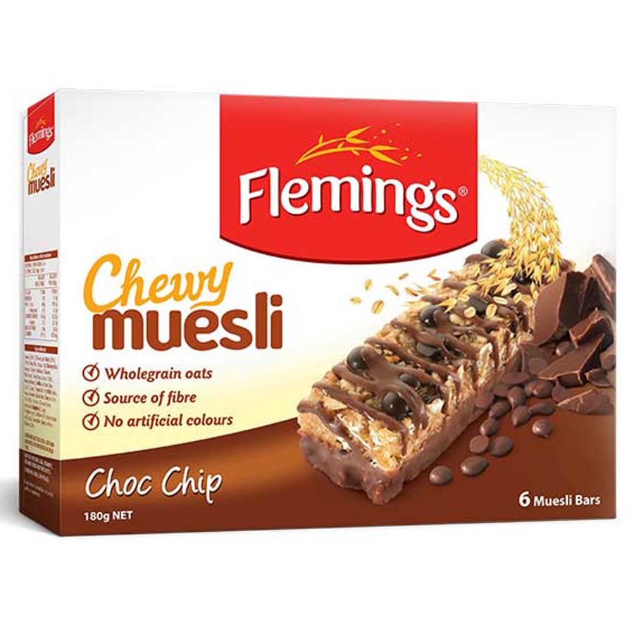 Flemings Muesli Bars Chocolate Chip are a tasty chocolate-flavoured snack made with oats and sprinkled with decadent choc chips. These soft, chewy bars are a good source of fibre and perfect for a satisfying treat any time of day.