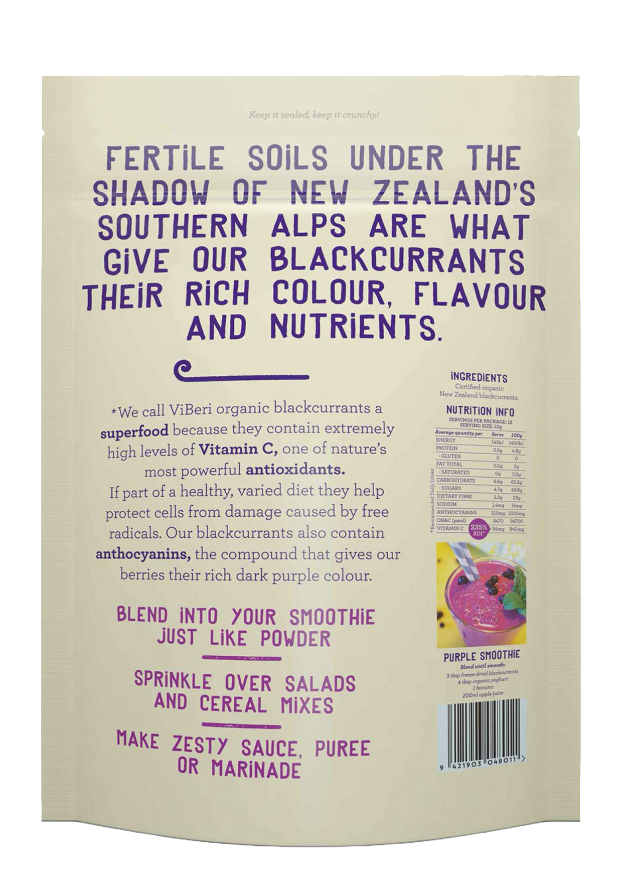 Our ViBERi Freeze Dried Organic Blackcurrants are true to nature: bursting with goodness and naturally containing exceptionally high levels of Vitamin C and anthocyanins which can offer so many amazing health benefits.