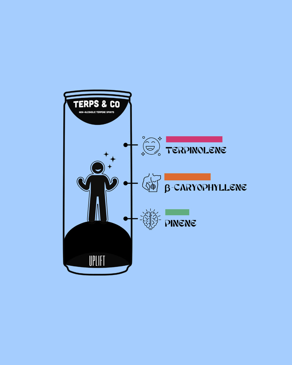 Terps & Co Alcohol-Free Beverages: All our non-alcoholic drinks are layered with complex flavours and notes. We infuse each product with a blend of 40 botanical terpenes that induce a mild feeling of increased energy, pleasure, and emotional warmth.