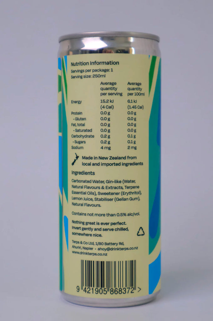 Ingredients: Carbonated Water, gin-like ( Water, Natural Flavours & Extracts, Terpene Essential Oils), Erythritol, Lemon Juice, Gellen Gum, Natural Flavours