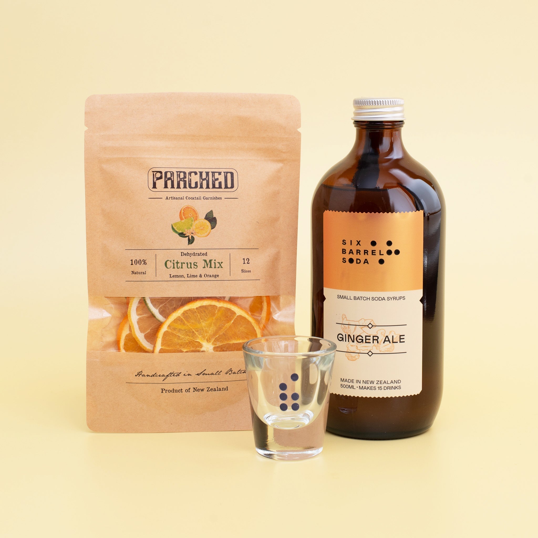 This pack contains our Ginger Ale Soda Syrup, Dehydrated Citrus Mix Parched garnishes, and a Six Barrel Soda measure glass. Perfect for making wonderful drinks at home!