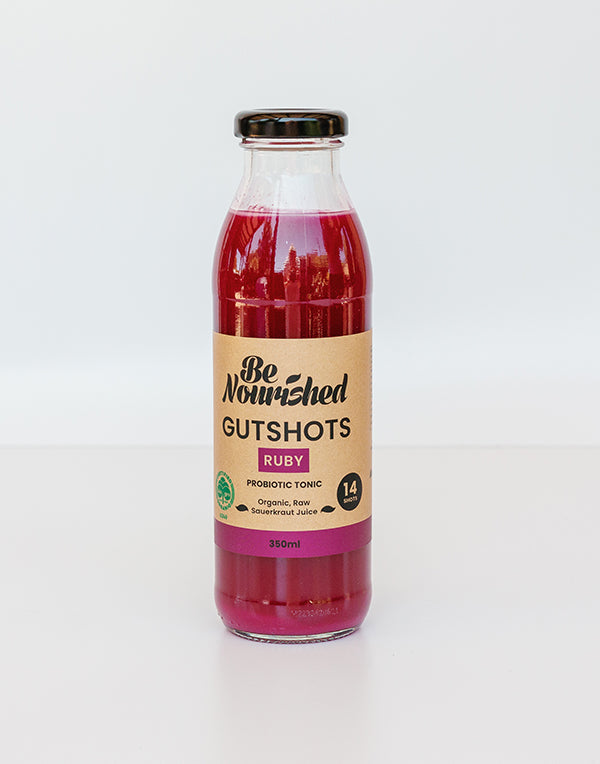 Our Ruby Probiotic Tonic is the perfect Gut Shot to choose when introducing this baby to your family and friends! This tangy mix of red and white cabbage with caraway seeds contains billions of live bacteria to help re-balance your gut flora. Pretty amazing, huh? Enjoy full-strength as a shot or add a splash to your smoothies, salad dressing, dips… the list goes on!