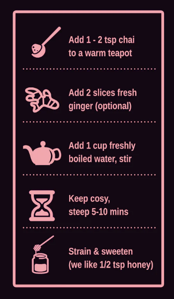 Fair Trade Honeybush*, Ginger*, Cinnamon*, Black Pepper*, Cardamom*, Cloves*, Fennel*, Mace*, Rose Petals*.