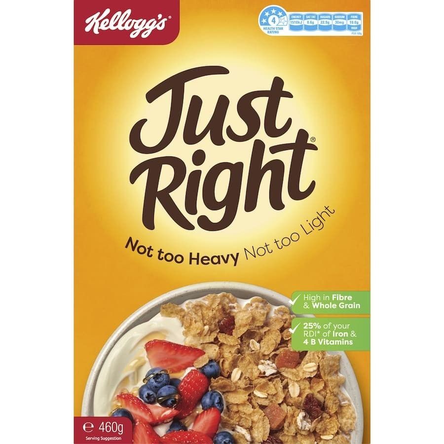 Kelloggs Just Right Cereal is a delicious blend of wholesome grains, sultanas, and apricot pieces. With its balanced texture, it's neither too heavy nor too light. Enjoy a nutritious breakfast that's high in whole grains and fibre, low in salt, and packed with B vitamins and iron for a great start to your day. Try mixing it with your favourite creamy yoghurt for an extra tasty treat!