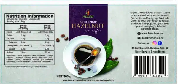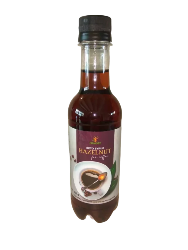 Frenchies Keto Sugar-Free Hazelnut Syrup – natural hazelnut flavour for rich, nutty coffee. Low-carb, keto-friendly, and proudly made in NZ.