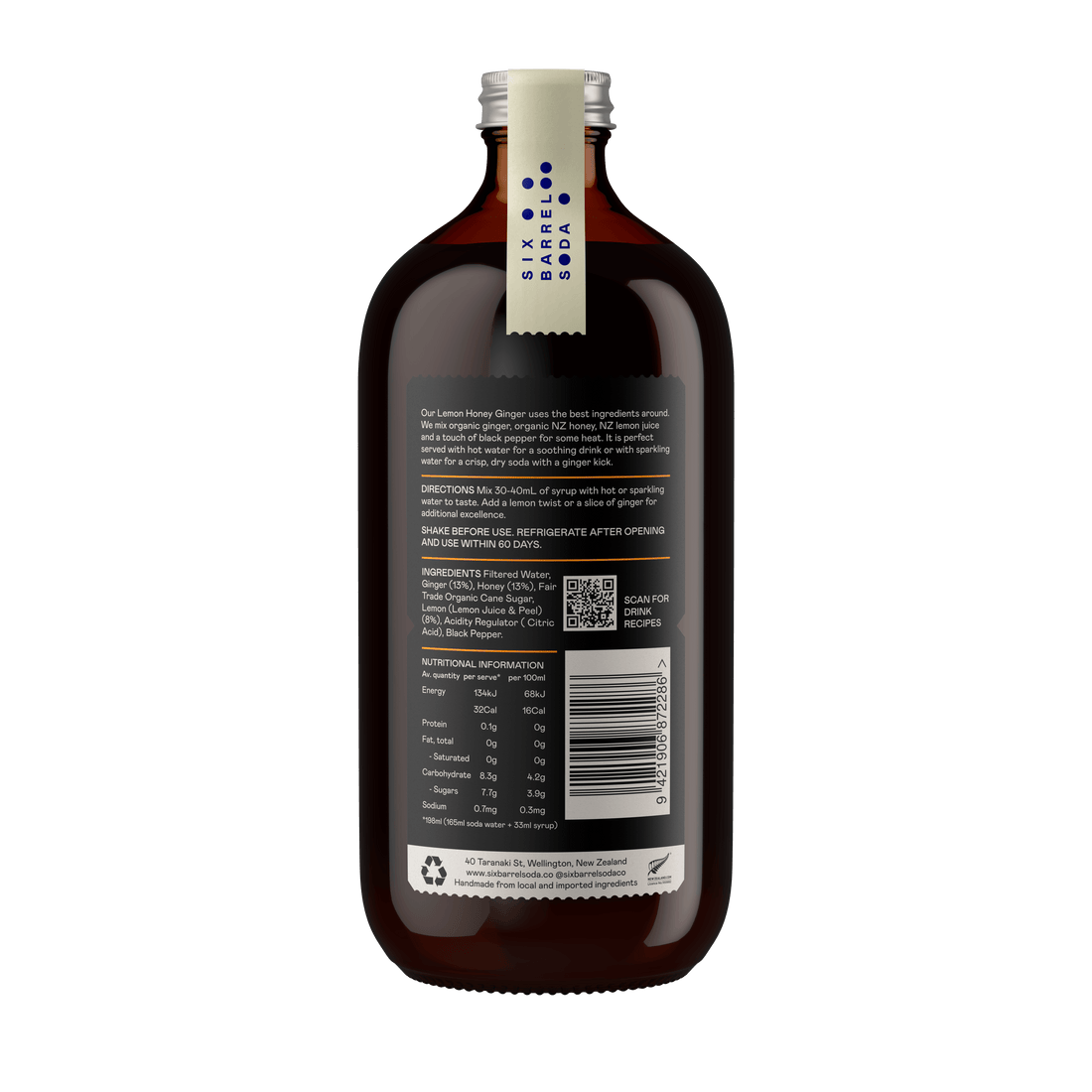 Our Lemon Honey Ginger Syrup is a hug in a mug and uses the best ingredients around. We mix organic ginger, organic NZ honey, NZ lemon juice and a touch of black pepper for some heat. It is perfect served with hot water for a soothing drink or with sparkling water for a crisp, dry soda with a ginger kick.