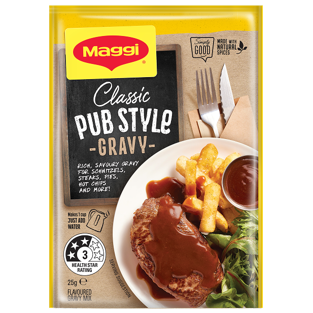 Enjoy the classic taste of the pub at home with MAGGI Classic Pub Style Gravy. This rich, savoury blend is perfect for pouring over schnitzels, steaks, pies, and hot chips. Preparing the gravy is quick and simple—just add 1 cup of boiling water and stir until smooth.