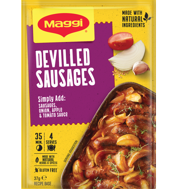 Maggi Recipe Base Devilled Sausages makes preparing a tasty family dinner simple and delicious. Create a healthy, balanced meal by adding sausages, onion, apple, and tomato sauce to the mix.