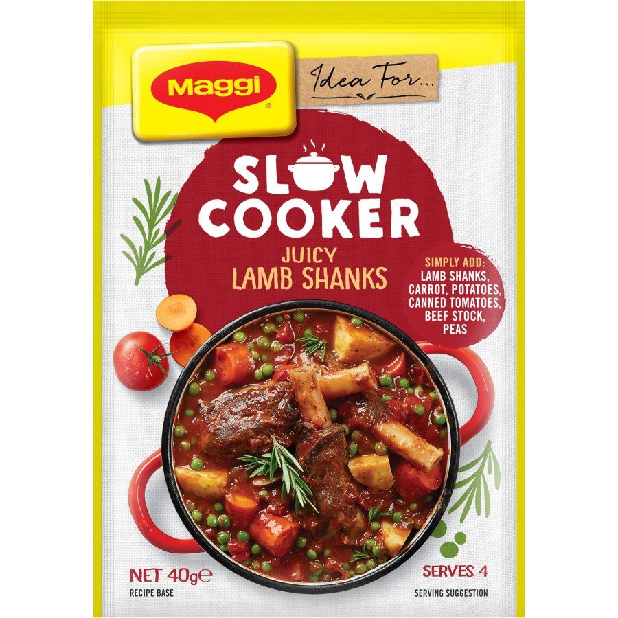 Maggi Slow Cooker Juicy Lamb Shanks recipe base makes preparing a delicious family meal simple and satisfying. Just add lamb shanks, carrot, potatoes, canned tomatoes, beef stock, and peas for an easy, balanced dinner everyone will enjoy.