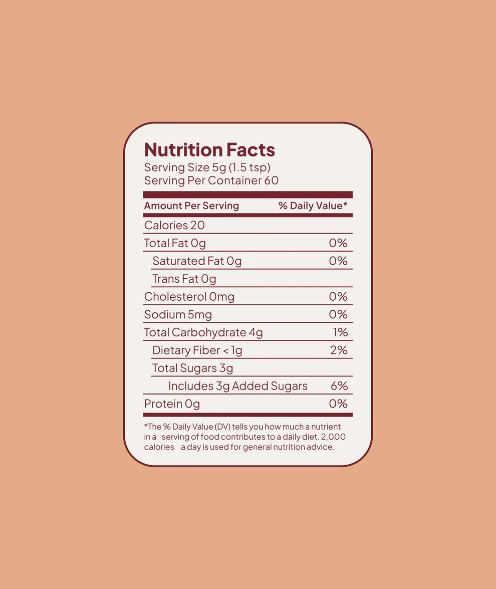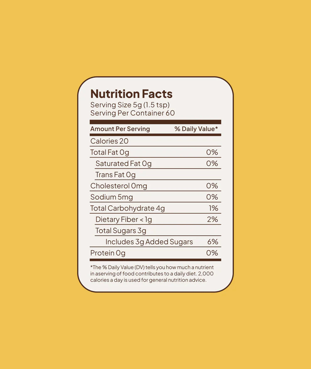 Sugar (Cane, Raw, Organic), Turmeric Powder (Organic), Ceylon Cinnamon Powder (Organic), Ginger Powder (Organic), Black Pepper Powder (Organic)