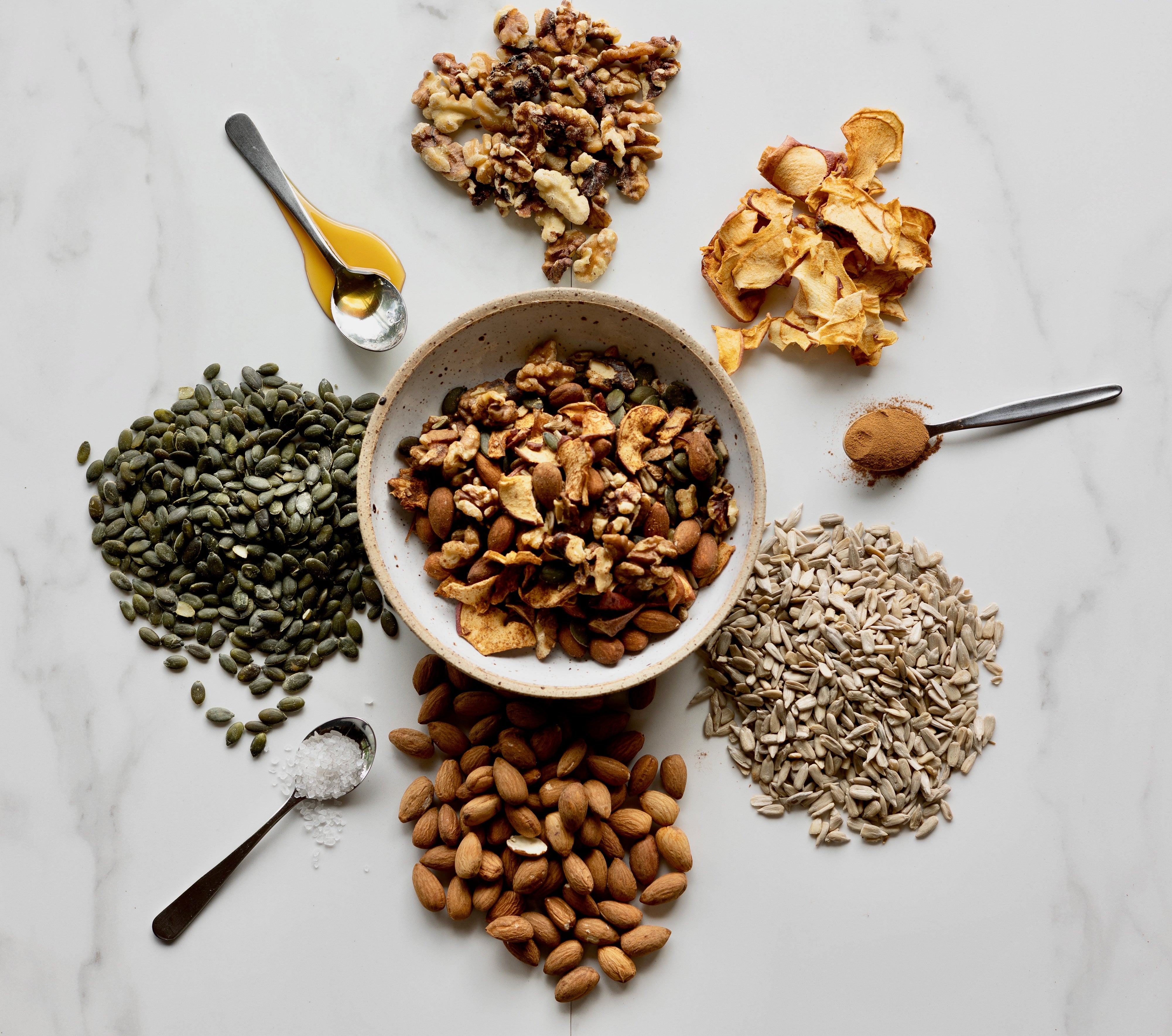 Ingredients: Activated almonds, walnuts, organic apple chips, organic activated sunflower seeds, organic activated pumpkin seeds, maple syrup, cinnamon, organic NZ sea salt.