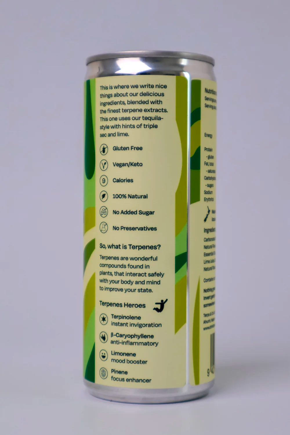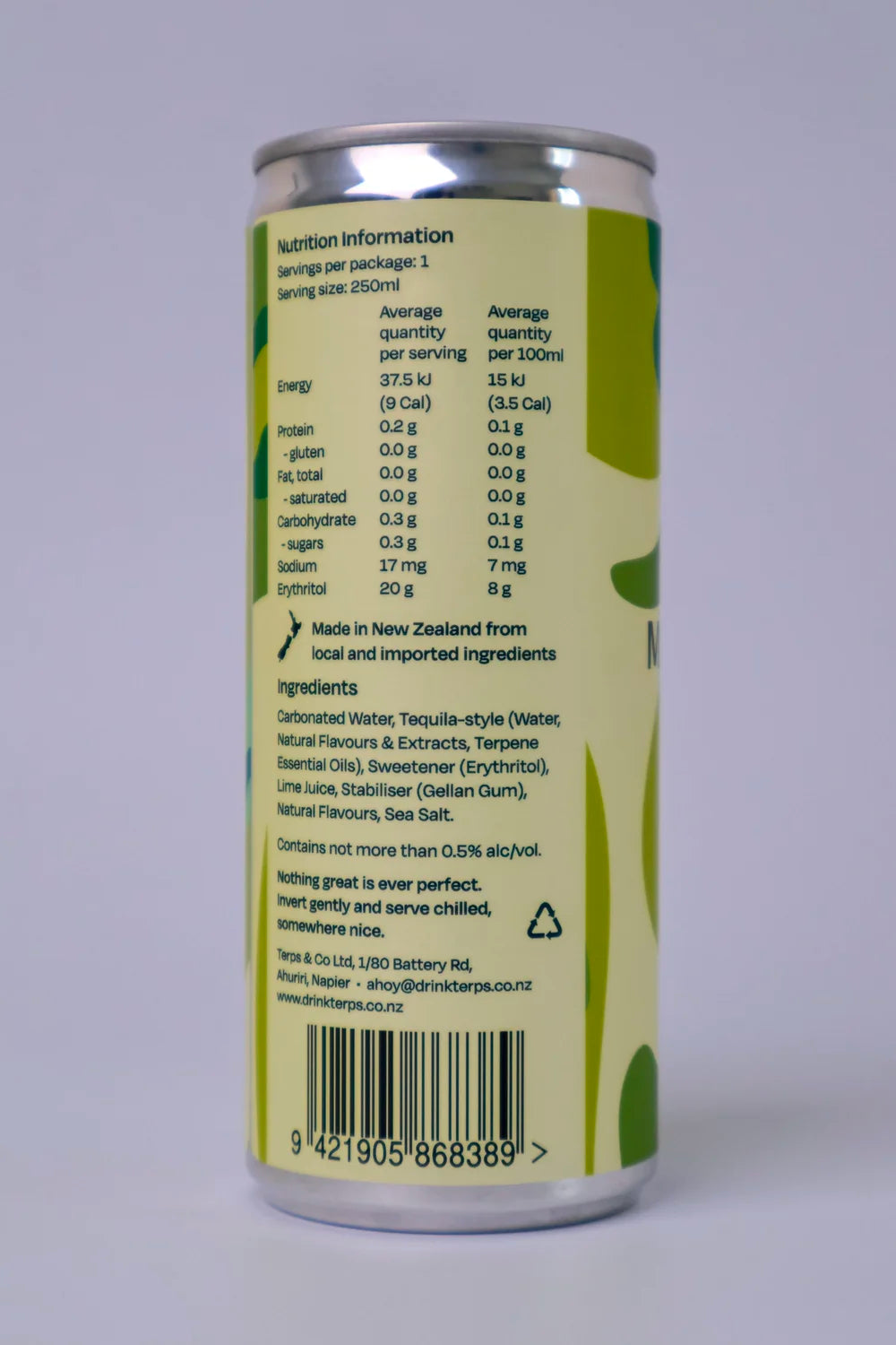 Ingredients: Carbonated Water, tequila-style ( Water, Natural Flavours & Extracts, Terpene Essential Oils), Erythritol, Lime Juice, Gellen Gum, Salt, Natural Flavours