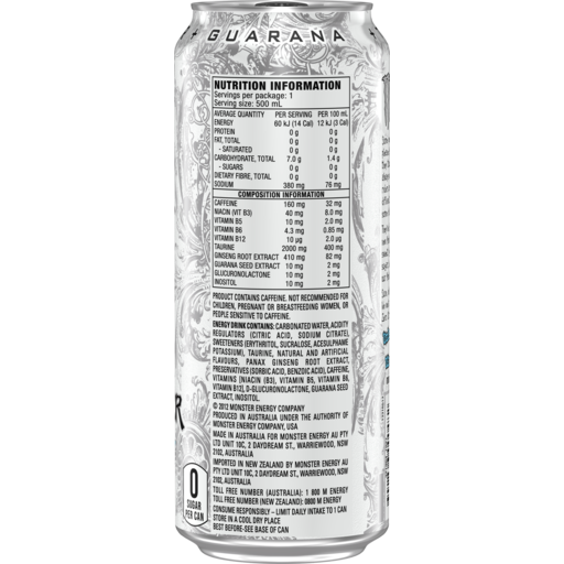 Carbonated Water, Acidity Regulators (Citric Acid, Sodium Citrate), Sweeteners (Erythritol, Sucralose, Acesulfame Potassium), Taurine, Natural and Artificial Flavours, Panax Ginseng Root Extract, Preservatives (Sorbic Acid, Benzoic Acid), Caffeine, Vitamins [Niacin (B3), Vitamin B5, Vitamin B6, Vitamin B12], D-Glucuronolactone, Guarana Seed Extract, Inositol.