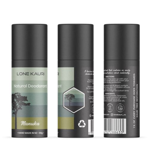 Lone Kauri places a strong focus on sustainability. Our deodorant sticks come in a sleek black recyclable cardboard tube and our courier bags are made from recycled and FSC certified paper that can easily be home composted or recycled once you are finished with them. Please recycle.