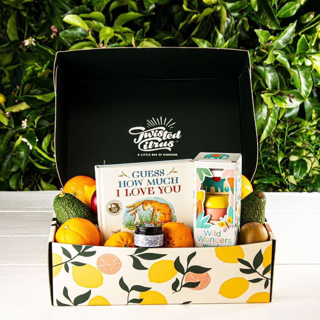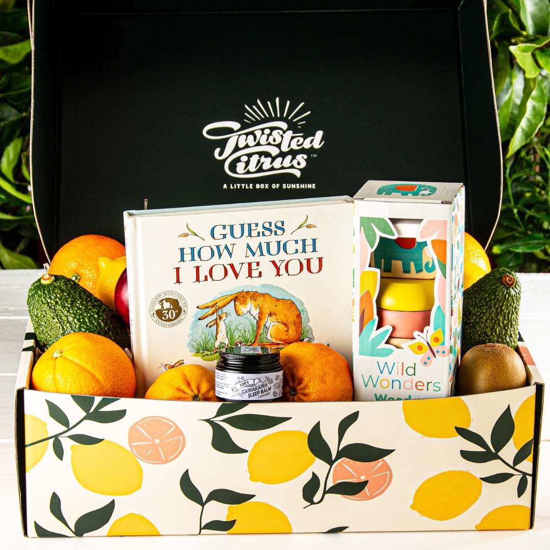 Celebrate a sweet new arrival with a delightful box of fresh fruit and thoughtful gifts for both baby and family.