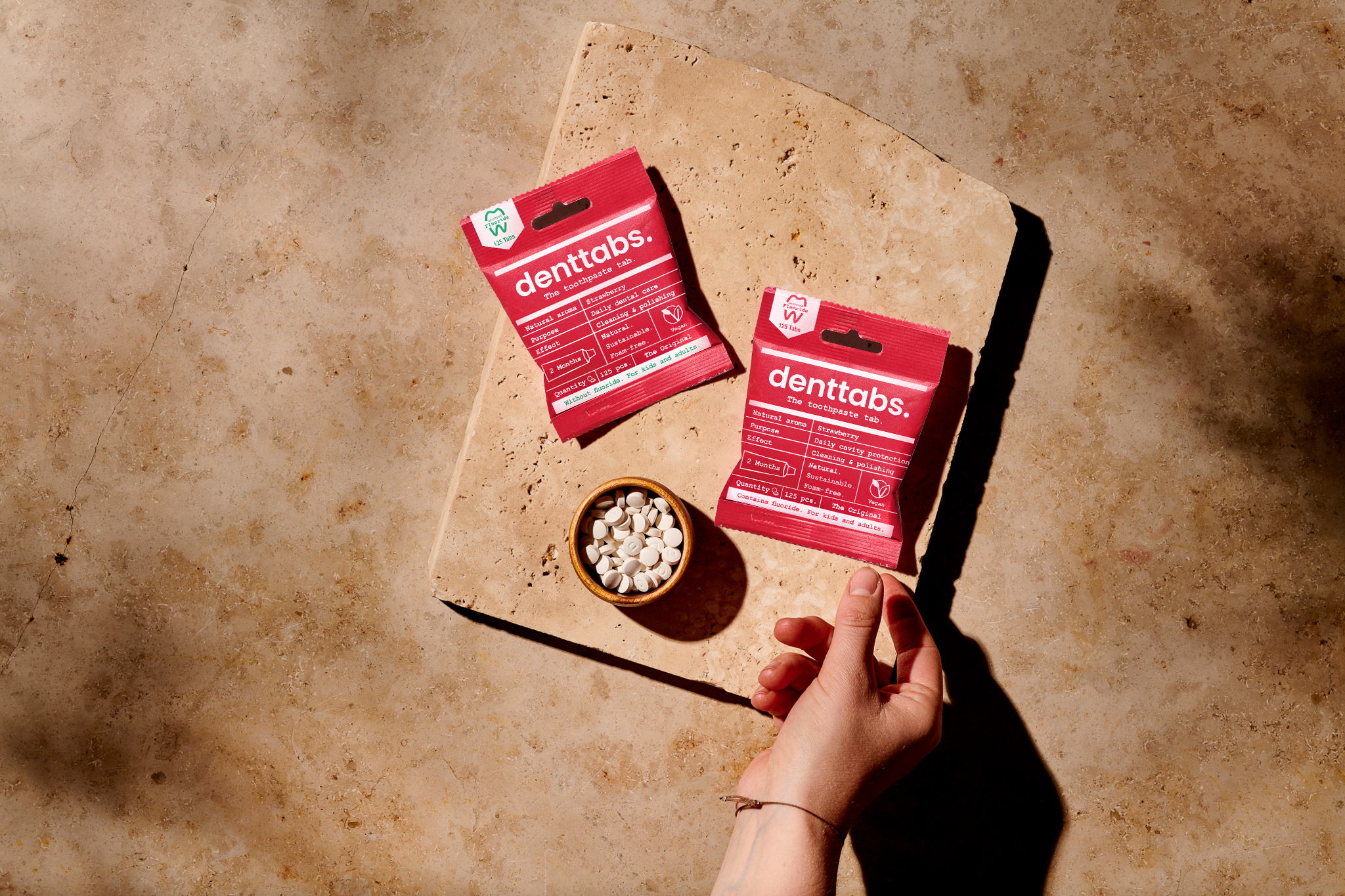 Did you know what’s in your toothpaste goes straight into your bloodstream? Get clinically proven clean teeth without chemicals and plastic tubes with Denttabs Toothpaste Tablets from CaliWoods. Chew the tablet until creamy, brush your teeth, then rinse!