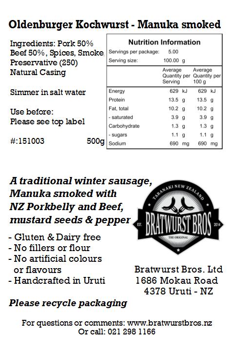 This traditional Northern Germany sausage is a typical winter sausage. They are Manuka smoked and air-dried. It is great in stews, with cooked green kale, or just sliced cold on fresh bread with mustard. Made from NZ pork belly, they are vacuum sealed in packs of 500g.