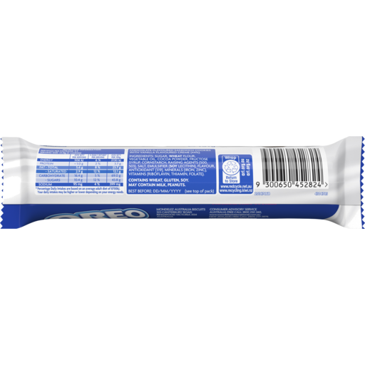 Chocolate flavoured sandwich cookies with vanilla flavoured creme (44%) Sugar, Wheat Flour, Vegetable Oil, Cocoa Powder, Fructose Syrup, Cornstarch, Raising Agents (500, 503), Salt, Emulsifier (Soy Lecithin), Flavour, Antioxidant (319), Minerals (Iron, Zinc), Vitamins (Riboflavin, Thiamin, Folate)
