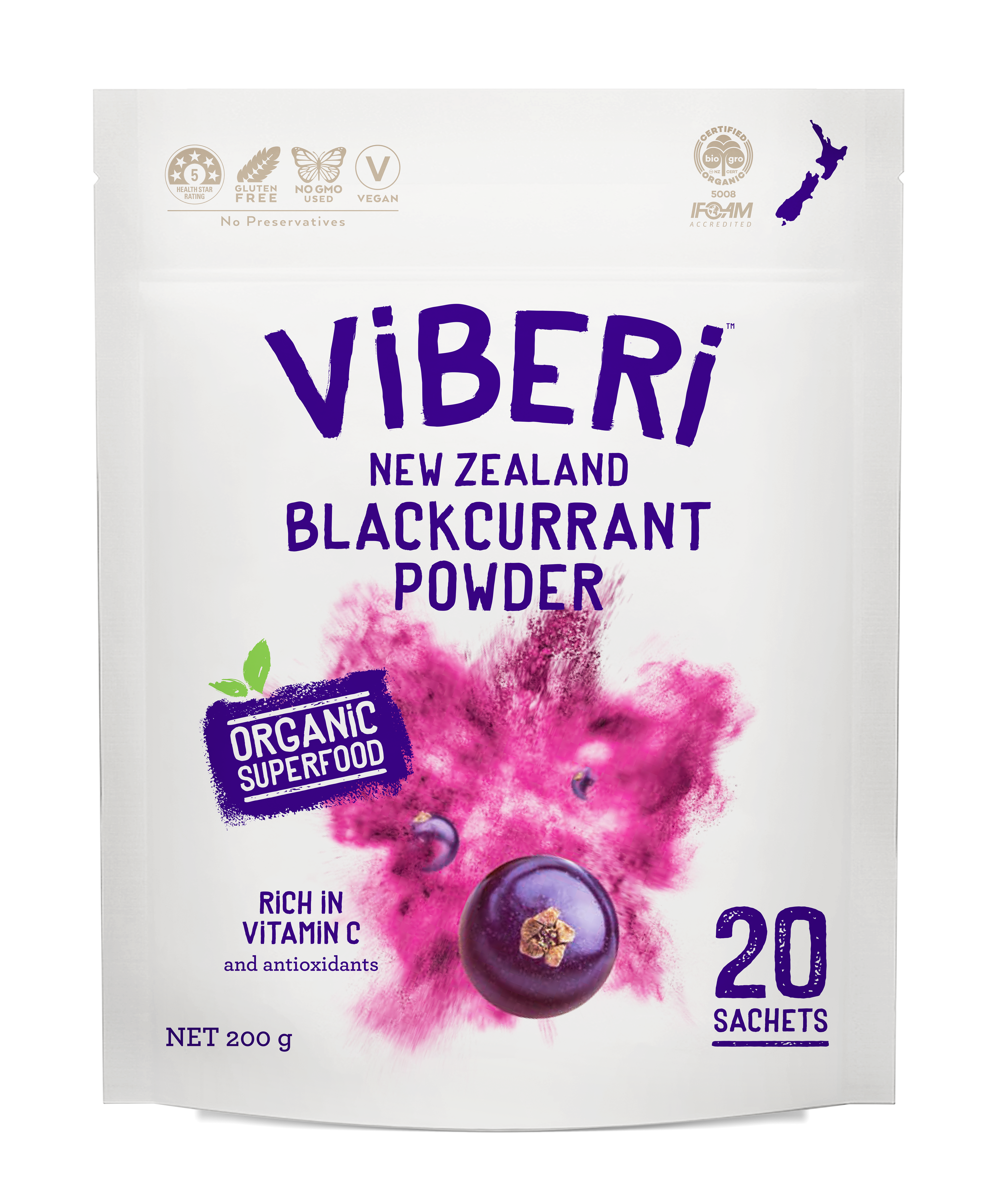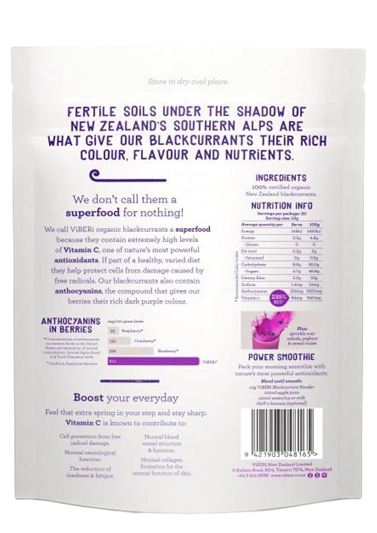 Our ViBERi Blackcurrant Powder is 100% Organic and contains only the pure goodness of New Zealand Blackcurrants.
