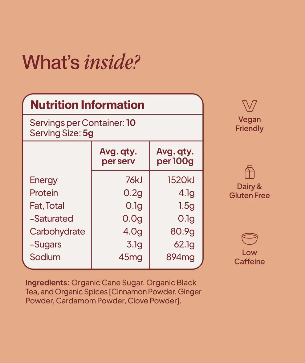 Organic Unrefined Cane Sugar, Organic Black Tea Powder, Organic Spice Flavours [Cinnamon, Ginger, Cardamom, Star Anise, Black Pepper, Clove].