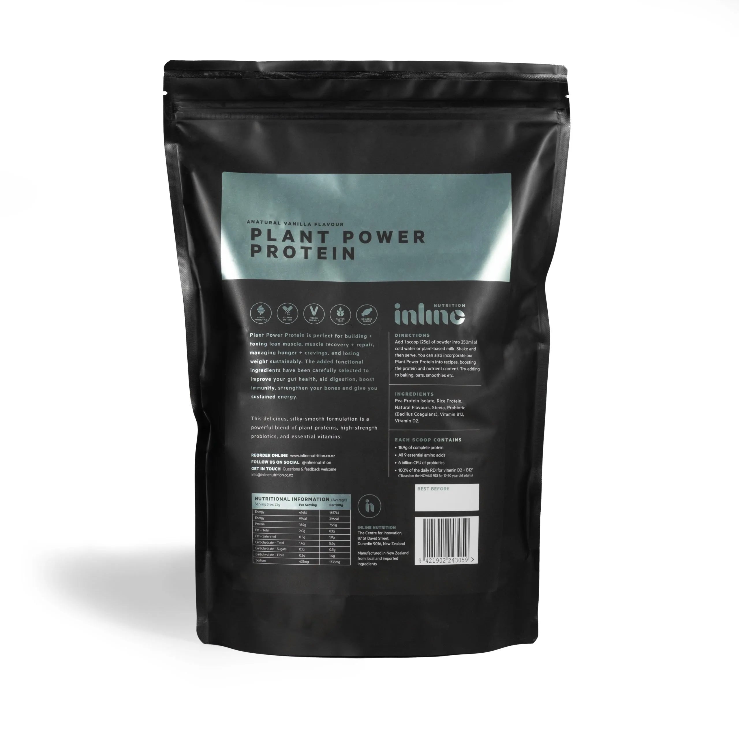 - Add 1 scoop (~25g) of Vanilla Plant Power Protein to 250ml of cold water or plant-based milk. Shake well – then serve.