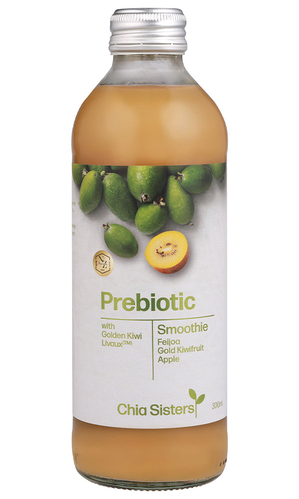 Chia Sisters prebiotic feijoa smoothie is a pure blend of fresh New Zealand feijoas and apples, carefully mixed with Livaux™ - a gold kiwifruit prebiotic. Livaux™ is sourced directly from Anagenix, a business that uses scientific research to harness the health benefits of plant bioactives.