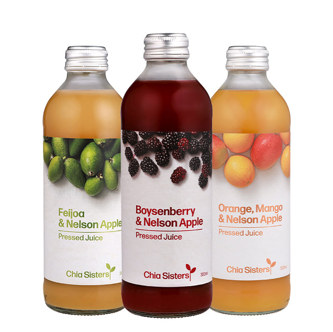 Chia Sisters keeps their juices simple- just as nature intended them to be. No artificial additives. Just fruit. The pressed juices come in three flavours; Orange & Mango, Feijoa, and Boysenberry. Each drink is a unique blend of fresh fruits sourced locally wherever possible. These pressed juices are naturally rich in vitamin C, made in Chia Sisters solar powered juicery, and free from refined sugar, preservatives and additives.