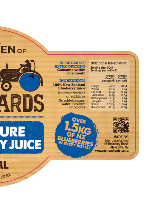 Each 750mL bottle is made with over 1.5kg of sustainably grown, hand-picked, and expertly juiced New Zealand blueberries. Our pure blueberry juice is bursting with vitamins, minerals, and antioxidants, including anthocyanins that are credited for their anti-aging effects.
