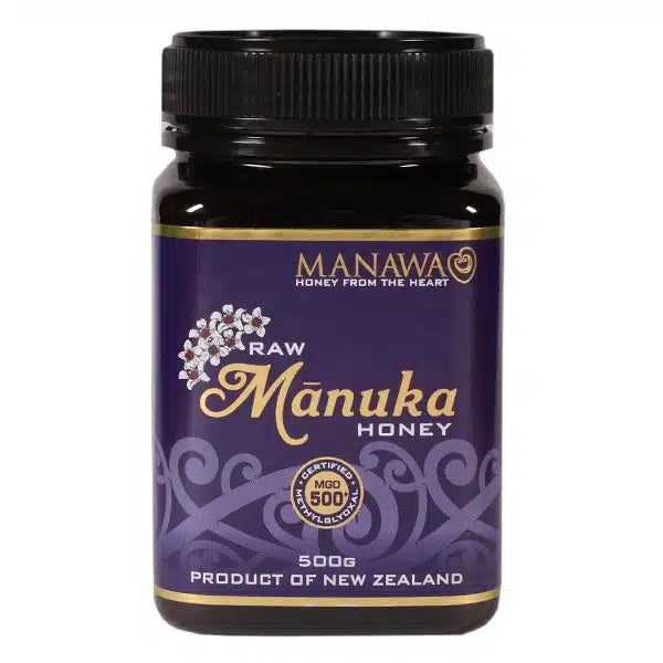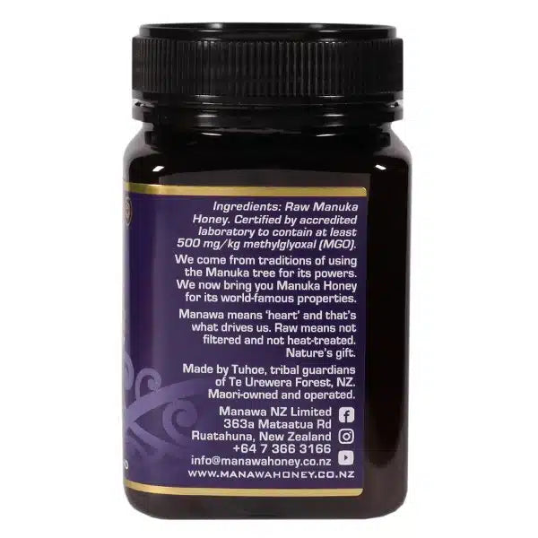 Raw Mānuka Honey MGO 500+ in 500g Limited edition of Raw Mānuka Honey in a premium grade – certified to contain at least 500 mg/kg methylglyoxal (MGO). Manawa means ‘heart’ and that’s what drives us. Raw means not filtered and not heat-treated. Mānuka means world-famous properties. Nature’s gift. Mānuka Honey has been shown through scientific studies across the world to have many beneficial properties, from anti-bacterial to anti-oxidant and anti-inflammatory. Our Mānuka Honey is tested by an independent internationally-accredited laboratory for methylglyoxal content that sets the rating that we apply for our Mānuka Honey. This certification behind every jar of our Mānuka Honey gives you confidence in the quality of our product. The Mānuka tree was traditionally used for a range of medicinal purposes. The Mānuka bark was boiled and the infusion drunk or applied externally to relieve pain. Infusions of the Mānuka bark, capsules and seed were also applied to burns and wounds, or for treating mouth, throat and eye affliction, and to reduce fever. Mānuka was also used to treat wounds on horses and other domestic animals. This traditional knowledge has been rediscovered by modern science demonstrating the power of Mānuka Honey in premium grades for health-giving and medicinal purposes. So here’s the others that we offer in our limited edition range for you: Raw Mānuka Honey MGO 500+ in 250g jar Raw Mānuka Honey MGO 400+ in 250g jar Raw Mānuka Honey MGO 400+ in 500g jar We recommend that you use our Raw Mānuka Honey daily as an elixir as a drink (in warm not hot water) or straight from the jar. Not recommended for infants under 12 months