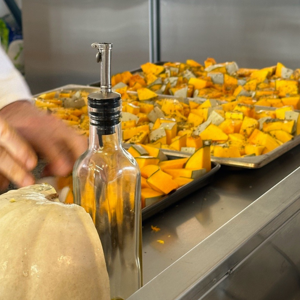 We roast fresh pumpkin in the ovens with herbs & a little olive oil, then mix it through the bread batter with fennel seeds. If some of the pieces of pumpkin don’t quite break up, we leave it that way so you may discover some intact pieces in the loaf as well.