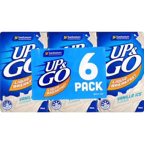 Sanitarium Up & Go Breakfast Drink Vanilla Ice 6pk offers a low fat, high fibre, and high calcium liquid breakfast. Perfect for busy mornings, it provides a quick and nutritious start to the day in a convenient shake format.