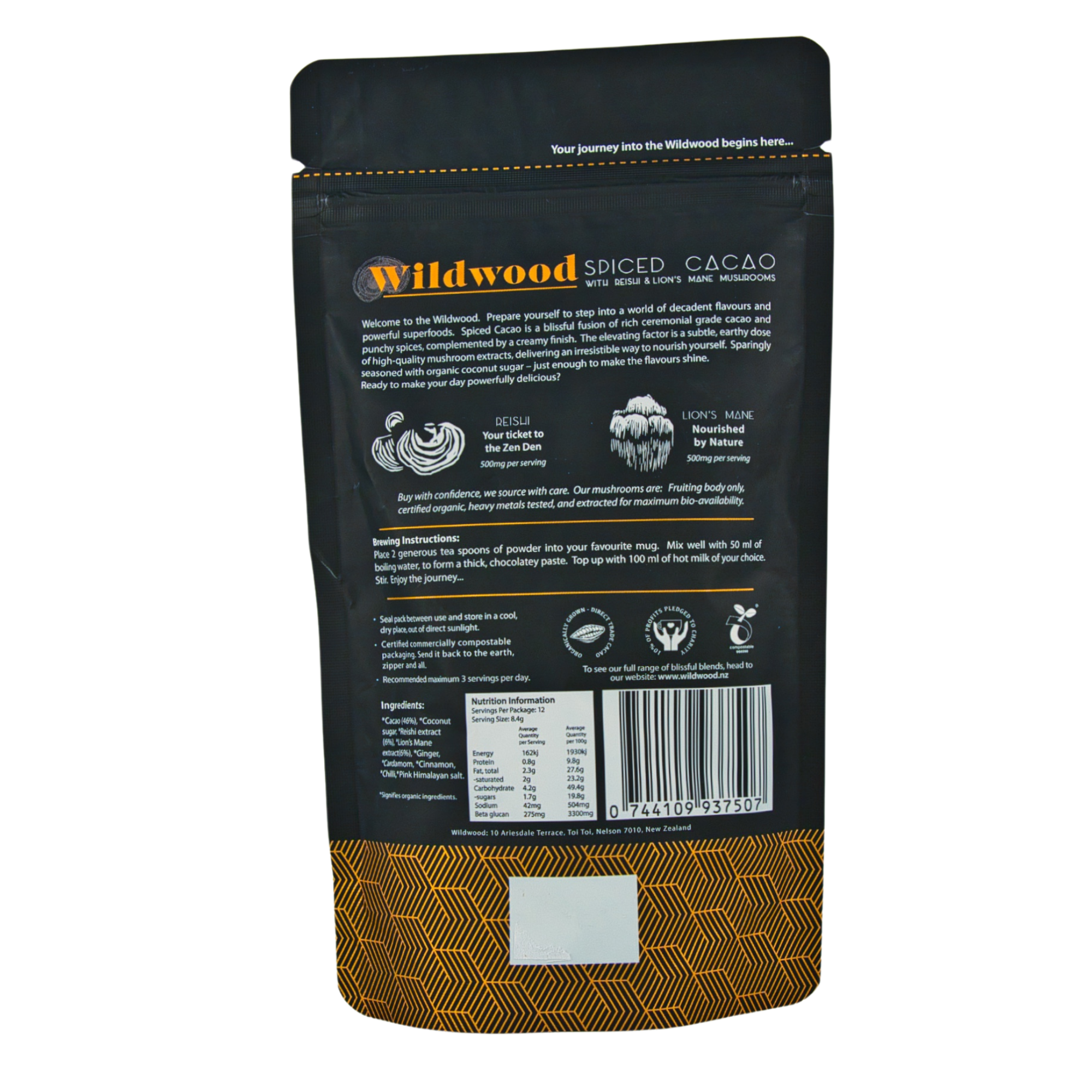 Welcome to the Wildwood. Prepare yourself to step into a world of decadent flavours and powerful superfoods. Spiced Cacao is a blissful fusion of rich ceremonial grade cacao and punchy spices, complemented by a creamy finish. The elevating factor is a subtle, earthy dose of high-quality mushroom extracts, delivering an irresistible way to nourish yourself. Sparingly seasoned with organic coconut sugar – just enough to make the flavours shine. Ready to make your day powerfully delicious?