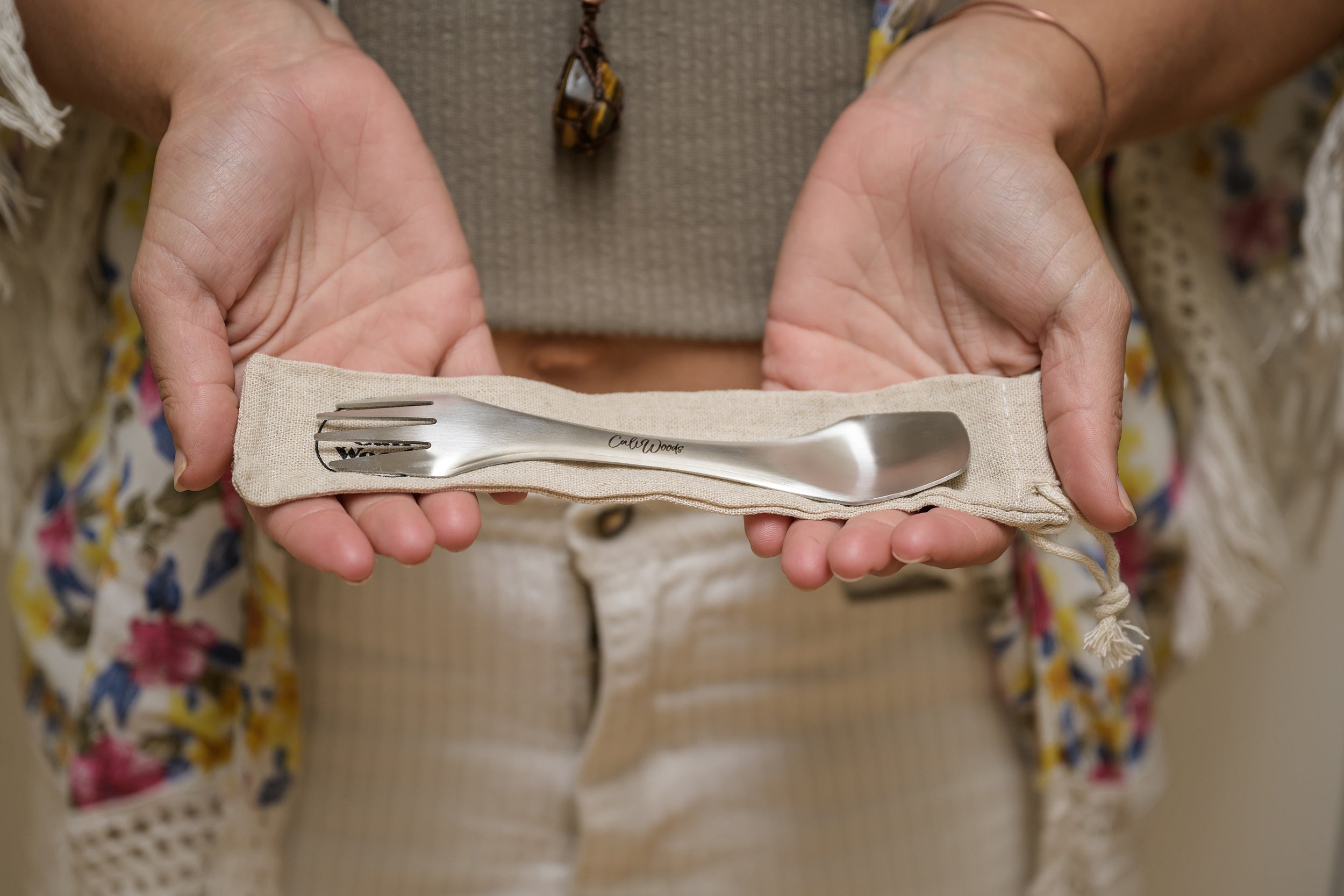 The CaliWoods Stainless Spork is convenient, compact and seriously useful! Think hikes, your glovebox, picnic, lunchboxes, handbag, and manbag - this nifty Stainless Steel Spork will do it all. A great eco-gift idea for guys. Spoon, fork, and knife in one.